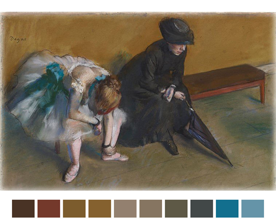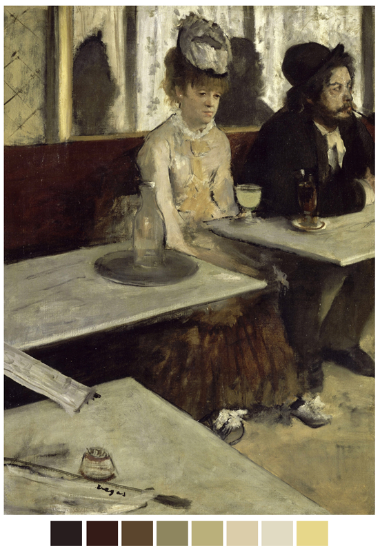 El acercamiento a la pintura de este artista del siglo XIX nos sirve desde varios aspectos para el proyecto de cortometraje Exprimida. Un poco por los temas que trata, otro poco por su técnica (óleo, pero también el pastel); también sus pinturas mayormente de espacios interiores y su trabajo de la luz; pero sobre todo porque en varios de sus cuadros maneja los colores de la paleta que mencioné en la anterior entrada a este blog.