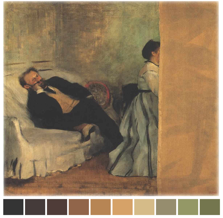 La espera (1880-82) // Paleta del polo cálido al frío; los marrones y rojos de Oscar hasta los azules de Camila.