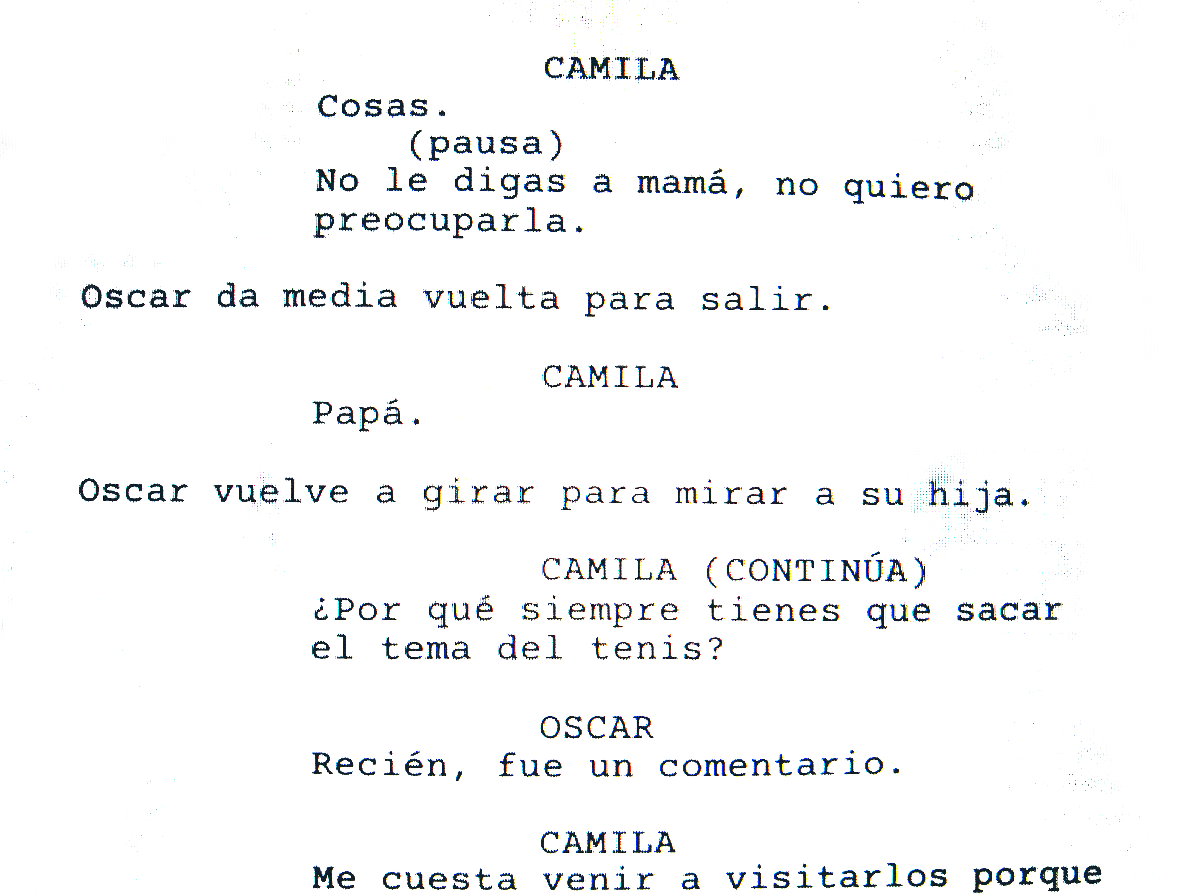 Por eso, cuando me puse a trabajar el guion técnico, me he dado cuenta que me gustaría que haya dos formas diferentes de abordar el montaje dependiendo el PDV que estemos utilizando. Por ejemplo, las escenas de Camila las imagino con bastantes cortes de plano y movimientos de cámara; generar un ritmo un poco frenético, para poder transmitir el vértigo que está viviendo el personaje, intentando relacionar los cortes de plano con su proceso mental. Por el contrario, las escenas trabajadas desde el PDV de sus padres, prefiero los planos fijos y más largos. Se subrayará su parsimonia, un ritmo lento, de pocos cortes; un acercamiento más contemplativo. Se apelará a una economía de planos, resolviendo las escenas con una o dos puestas. Estas serán fijas y estables.